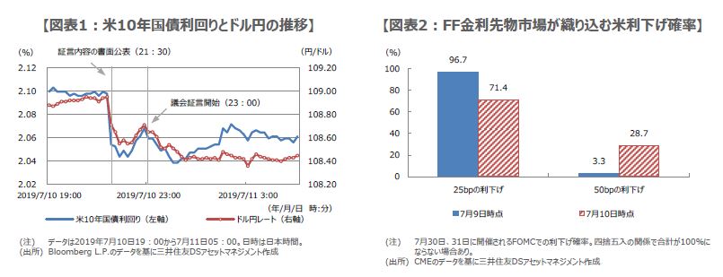 7月10日の米国市場では、パウエル議長のハト派姿勢維持が好感され、株価は上昇、国債利回りは上昇(価格は下落)、米ドルは日本円など対主要通貨で下落し(図表1)、リスクオン(選好)の動きが強まりました。また、フェデラルファンド(FF)金利先物市場では、7月30日、31日に開催されるFOMCで、50bpの利下げ実施確率が、前日から大きく上昇しました(図表2)。