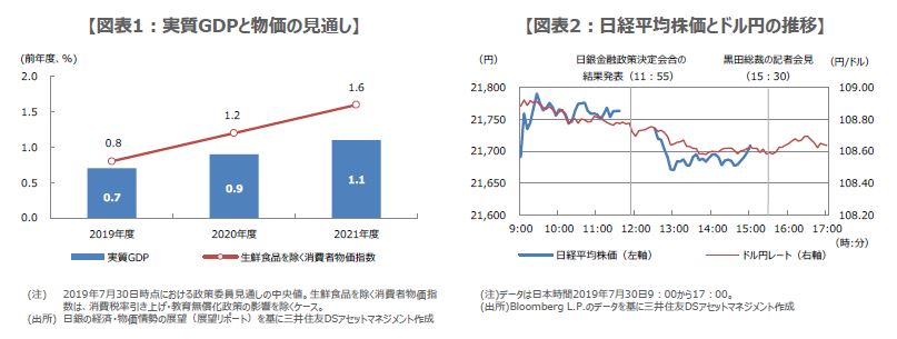 なお、3カ月に1度改定される「経済・物価情勢の展望(展望リポート)」が7月30日に公表され、実質GDPの前年度比伸び率は、2019年度と2021年度の見通しが0.1ポイントずつ引き下げられました。また、生鮮食品を除く消費者物価指数の前年度比伸び率は、2019年度と2020年度の見通しが0.1ポイントずつ引き下げられました。ただ、いずれも小幅な修正にとどまり、景気の拡大基調が続くとの見方は維持されました(図表1)。