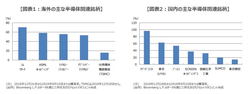 まず、海外の半導体関連銘柄の動きを確認します。7月の決算発表で前向きな見方を示した、オランダの半導体露光装置世界最大手、ASMLと、台湾の半導体受託生産の世界最大手、台湾積体電路製造(TSMC)は、米中の対立が激しさを増した8月に入り、ともに株価がやや低迷しました。しかしながら、その後は持ち直し、年初からの騰落率はASMLが+58.3%、TSMCが+16.0%となっています(図表1)。