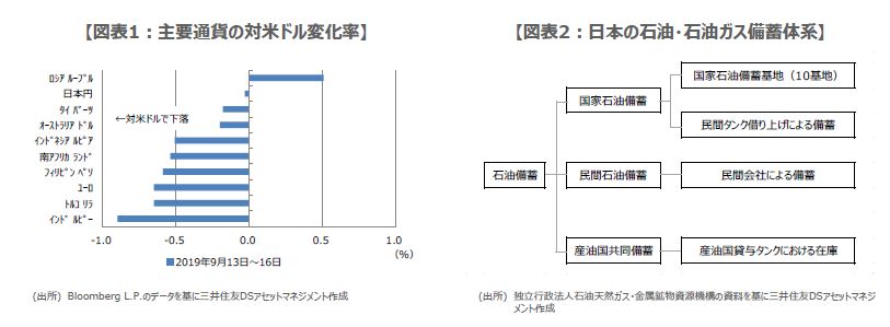週明け9月16日の米国市場では、原油供給不足への懸念から、WTI原油先物価格が急騰し、一時1バレル=63ドル38セントの高値をつけました。また、地政学リスクの高まりから、ダウ工業株30種平均などの主要株価指数がそろって下落し、米10年国債利回りは低下(価格は上昇)しました。一方、為替市場では、米ドルや日本円が対主要通貨で買われたため(図表1)、ドル円で大幅なドル安・円高が進行することはありませんでした。