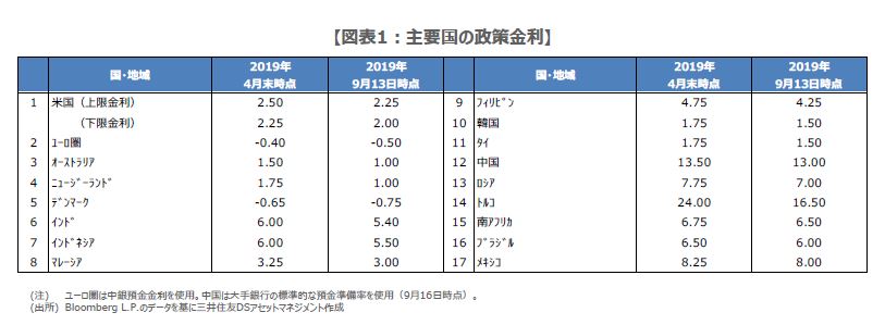 次に、主要国の金融政策、財政政策の動向を確認します。5月以降、利下げに踏み切った国は、先進国では米国、ユーロ圏、オーストラリア、ニュージーランドなど、アジアではインド、インドネシア、マレーシア、フィリピンなどです。他にも、ロシア、トルコ、南アフリカ、ブラジルなどが利下げを実施しており、5月以降、主要17カ国・地域で金融緩和が行われたことになります(図表1)。
