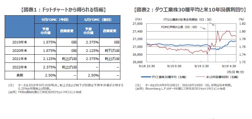 次に、FOMCメンバーが適切と考える政策金利水準の分布図(ドットチャート)に目を向けると(図表1)、中央値が示唆する年間の政策変更回数は、2019年と2020年は0回(すなわち今回の利下げで打ち止め)、2021年と2022年は、0.25%の利上げがそれぞれ1回ずつとなりました。FF金利先物市場では、来年にかけて2回強の追加利下げが織り込まれていますので、それと比べた場合、ドットの分布はタカ派的といえます。