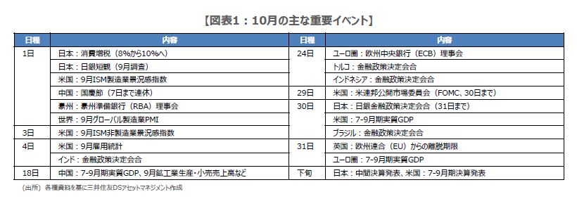 金融政策面では、10月29日、30日に米連邦公開市場委員会(FOMC)が開催されます。弊社は0.25%の追加利下げを見込んでいますが、これ以降、想定以上の米経済指標の悪化や米中対立のエスカレートがなければ、利下げはいったん打ち止めを予想します。また、10月30日、31日の日銀の金融政策決定会合では、経済・物価動向の点検が行われます。足元程度の市場環境が続けば、マイナス金利の深掘りを急ぐ必要はなく、追加緩和を行うとしても、フォワードガイダンスの変更にとどまると想定しています。