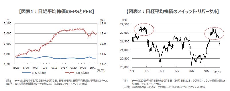 ここ最近の日経平均株価の動きについて、予想利益ベースの1株あたり利益(EPS)と株価収益率(PER)に分けたものが図表1です。これをみると、9月の株高は、業績を反映したEPSの上昇によるものではなく、期待や思惑を反映したPERの上昇が主導したものであることが分かります。この場合、一般に株高の持続性は乏しく、実際、今回のように米景気減速の思惑が強まると、PERの下落主導で株価は下げやすくなります。
