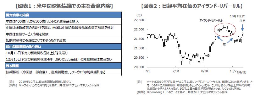 その意味で、今回の結果は、直前に広がった市場の期待通りのものと考えられます。日経平均株価は10月15日、前週末比264円84銭高(+1.2%)の、22,063円71銭で寄り付き、協議結果を素直に好感した動きとなっています。また、テクニカル分析上では、「アイランド・リバーサル」の下落シグナルが10月11日時点で消滅したため(図表2)、目先、株価が大きく下げる可能性は低下したと解釈できます。