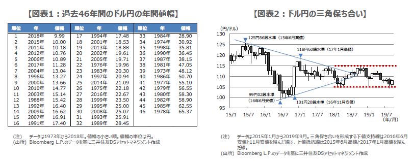 2019年のドル円の値幅は、1月1日から10月17日までで、7円94銭程度です。2018年は9円99銭程度と、過去46年間で最小でしたが(図表1)、2019年はこれを更新する可能性があります。値幅が小さい理由は、基軸通貨である米ドルと世界一の対外純債権国である日本の円が、リスクオフ(回避)の局面ではともに買われ、リスクオン(選好)の局面ではともに売られるなど、同方向に動く傾向があるためです。