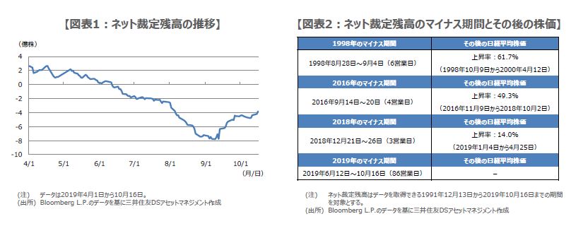 過去、ネット裁定残高がマイナスとなるような状況は、一時的なものでした。例えば、1998年は8月28日から9月4日までの6営業日、2016年は9月14日から20日までの4営業日、2018年は12月21日から26日までの3営業日でした。いずれの場合でも、その後はネット裁定残高がプラスに転じ、需給の改善とともに株価は上昇しました。しかしながら、2019年は6月12日から10月16日まで、86営業日連続でマイナスです(図表2)。