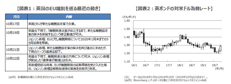 英国の欧州連合(EU)離脱問題について、最近の動きを整理します(図表1)。英国とEUは10月17日、新たな離脱協定案で合意しました。従来の協定案には、アイルランド国境問題を解決する具体策がみつかるまで、英国はEUの関税同盟にとどまる「安全策」が盛り込まれていました。新たな協定案ではこの安全策が削除され、2020年末の移行期間終了後、英国は北アイルランドも含めて関税同盟から離脱することになります。