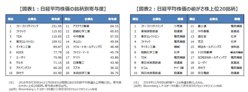 この上げ幅に対し、寄与度が最も大きかったのは、ファーストリテイリングの231円95銭でした。その次に大きかったのは、ファナックの115円92銭です。以下、順にTDKの110円65銭、東京エレクトロンの109円51銭、ダイキン工業の89円87銭となっています(図表1)。5銘柄の寄与度を合計すると、657円90銭になりますが、これは上げ幅の約25%に相当します。