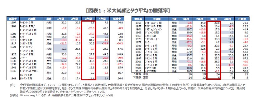 次に、②の任期4年間における各年の株価動向を確認します。図表1をみる限り、任期3年目、すなわち大統領選挙の前年は、株価が上昇しやすい傾向がうかがえます。マッキンリー大統領Ⅰ期からオバマ大統領Ⅰ期までの全30回のうち、任期3年目に株価が上昇したのは24回で、その確率は80.0%に達します。なお、トランプ米大統領は今年が任期3年目ですが、昨年末から11月11日まで、今のところ18.7%上昇しています。