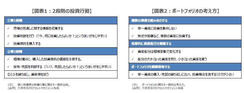投資先に迷うのは、次のような2段階の投資行動が関係していると推測されます(図表1)。投資信託を例にとれば、①市場の見通しに関する情報を収集し、投資信託を購入する。②その後、相場が投資判断に合致した動きとなり、購入した投資信託に含み益が発生すれば、売却して利益を確定する。そして、再び①に戻り、これを繰り返すという行動です。「今、何に投資したらよいか?」という質問は、①の段階での質問ということになります。