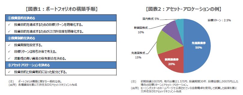 ポートフォリオの構築手順は次の通りです(図表1)。すなわち、①「投資目的(目標リターンとリスク許容度)」を明確に決める。②「投資制約(投資期間など)」を明確に決める。③投資目的と投資制約に沿ってアセット・アロケーションを決める、という流れです。その後は、構築されたポートフォリオに基づき投資を実行します。投資期間中は、定期的にパフォーマンスを評価し、必要に応じてポートフォリオを修正することになります。