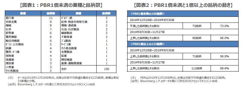 しかしながら、その後は米中貿易協議の進展期待を背景にバリュー株が急速に買い戻され、PBR1倍割れの100銘柄のうち、2019年8月30日から11月27日までの期間で上昇したのは95銘柄に達しています。一方、PBRが1倍以上の125銘柄については、2018年12月28日から2019年8月30日までの期間で5割強の71銘柄が上昇し、2019年8月30日から11月27日までの期間でも約9割の112銘柄が上昇しています。