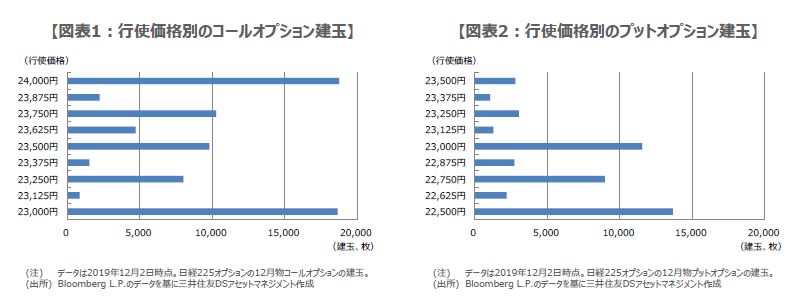 コールオプションの建玉は、23,500円、23,750円、24,000円の行使価格で大きく積み上がっているため、SQ直前の日経平均株価の水準次第では、コールオプションの売り手によるデルタヘッジと、裁定業者による裁定買い取引が相次いで行われ、24,000円台回復の展開も想定されます。ただし、12月物プットオプションに目を向けると、23,000円、22,750円、22,500円の行使価格で建玉が積み上がっており、こちらにも注意が必要です(図表2)。