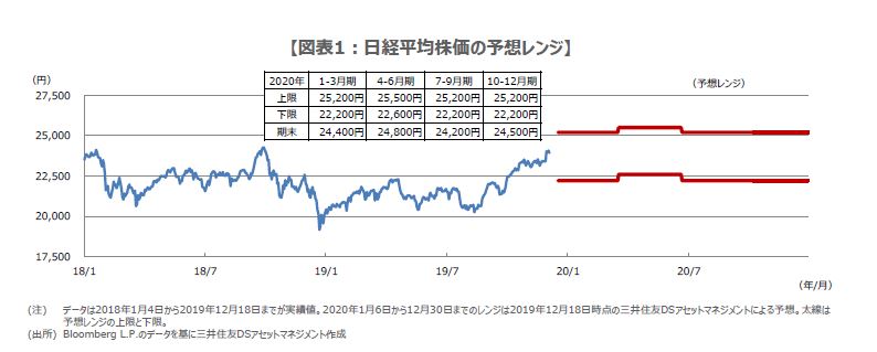 弊社は日経平均株価について、2020年1-3月期の予想レンジを22,200円~25,200円、3月末の着地を24,400円に設定しています(図表1)。日経平均株価はこの時期に、2018年10月2日につけた終値ベースでのバブル崩壊後最高値、24,270円62銭を更新する可能性が高いとみています。また、2020年4-6月期の予想レンジは22,600円~25,500円、6月末の着地は24,800円で、上昇基調が続くと考えています。