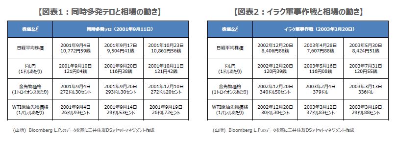 また2003年3月20日、米英軍は対イラク軍事作戦(イラクの自由作戦)を開始し、4月9日には首都バグダッドを制圧しました。イラク情勢の緊迫は事前に相当程度、高まっていましたので、軍事作戦の開始3カ月前を基準として、日経平均株価、ドル円、WTI原油先物価格、金先物価格の動きを確認してみます。作戦開始3カ月前の水準を回復した時期は、日経平均株価が2003年5月中、ドル円は7月中で、WTI原油先物価格と金先物価格は、軍事作戦の開始前でした(図表2)。