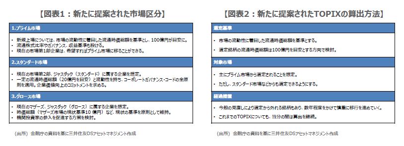市場区分については、「プライム市場」、「スタンダード市場」、「グロース市場」の3区分が提案されました(図表1)。プライム市場への新規上場については、市場の流動性に着目した「流通時価総額」を基準とし、100億円が目安になることが示されました。このほか、流通株式比率やガバナンス、収益基準も設けられる見通しです。なお、現在の市場第1部企業は、希望すればプライム市場に移れるとし、新基準の強制適用は見送られる模様です。