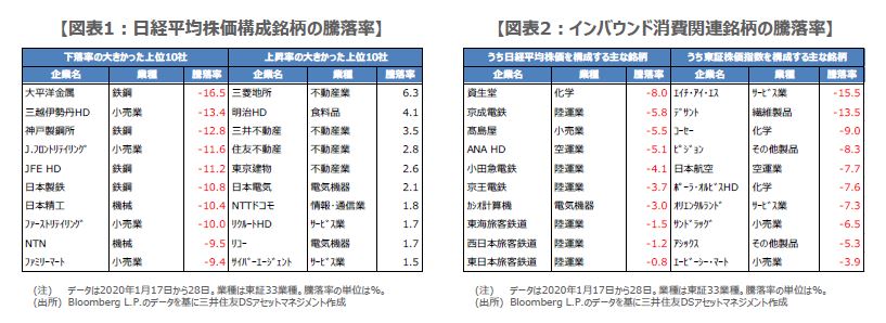 図表1で下落率の大きかった企業の業種をみると、鉄鋼、小売業、機械が目立ち、記載はされていませんが、11位以降には非鉄金属が続きます。これは、「新型肺炎の感染拡大」→「中国経済の減速」→「世界経済への影響拡大」「鉄や非鉄金属、設備投資に対する世界的な需要減少」、「中国人によるインバウンド消費の減少」という連想が強く働いた結果と推測されます。