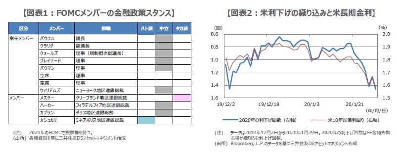 弊社では、クリーブランド地区連銀のメスター総裁は、物価を重視する「タカ派」、ミネアポリス地区連銀のカシュカリ総裁は、景気を重視する「ハト派」とみています(図表1)。そして、フィラデルフィア地区連銀のハーカー総裁と、ダラス地区連銀のカプラン総裁は、「中立」と考えています。なお、常任メンバーの金融政策スタンスは全員「中立」とみられ、これを踏まえると、2020年の金融政策は当面現状維持の可能性が高いと思われます。