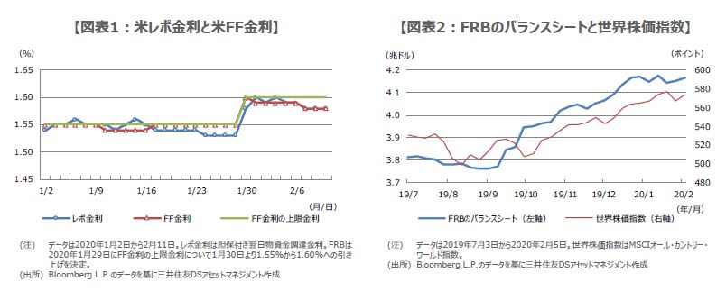 つまり、FRBが短期国債を購入する目的は、バランスシート拡大によって準備預金を増やし、FF金利やレポ金利の上昇を抑制することにあります。また、FRBは別途、金利の上昇を抑制するため、システムレポ(国債などを担保とする金融機関への資金供給)も臨時措置として行っています。これら一連の政策が奏功し、足元のレポ金利とFF金利は、FF金利の誘導目標の上限を下回って推移しています(図表1)。