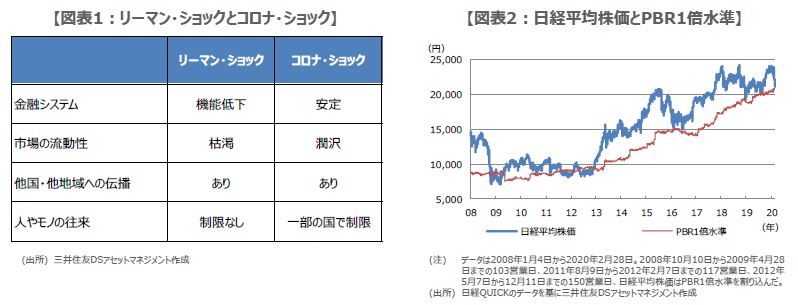 日経平均株価については、株価純資産倍率(PBR)1倍の水準である、20,700円レベルでの攻防に注目しています。過去、リーマン・ショックや欧州債務危機など、金融システムへの不安が高まった際、日経平均株価のPBR1倍割れは、長期にわたって発生しました(図表2)。今回、金融システムは安定していますが、一時的にPBR1倍を割り込む恐れもあり、株価の本格的な反転上昇には、感染者数の世界的なピークアウトという材料が待たれます。