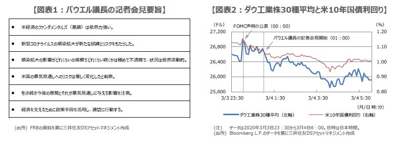 米連邦準備制度理事会(FRB)は3月3日、臨時の米連邦公開市場委員会(FOMC)を開催し、フェデラルファンド(FF)金利の誘導目標を年1.50%~1.75%から年1.00%~1.25%に引き下げることを決定しました。パウエル議長はその後の記者会見で、「今後の展開とそれが景気見通しに与える影響を注視し、経済を支えるために政策手段を活用し、適切に行動する」と述べ、追加利下げの可能性も示唆しました(図表1)。