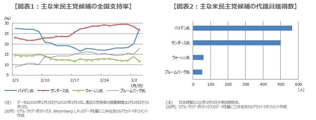 開票の結果、バイデン氏が10州、サンダース氏が4州でそれぞれ勝利し、代議員獲得数でバイデン氏がトップに躍り出ました(図表2)。バイデン氏は、事前調査で劣勢が予想されていましたが、ブティジェッジ氏とクロブシャー氏の支持を取り付けたことが、今回の躍進につながったとみられます。なお、支持拡大に苦戦したブルームバーグ氏は4日に指名争いから撤退し、バイデン氏を支持すると表明しました。