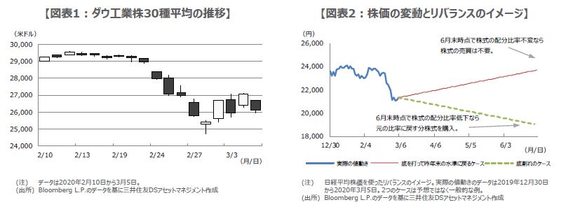 ダウ工業株30種平均は2月27日、前日比1,190ドル95セント安となり、1日の下げ幅としては過去最大を記録しました。一方、3月2日には前週末比1,293ドル96セント高となり、今度は1日の上げ幅として過去最大を記録しました。その後も、おおよそ1,000ドル幅で上昇と下落を繰り返すなど、総じて不安定な値動きが続いており(図表1)、日経平均株価もまた、振れ幅の大きい相場展開となっています。