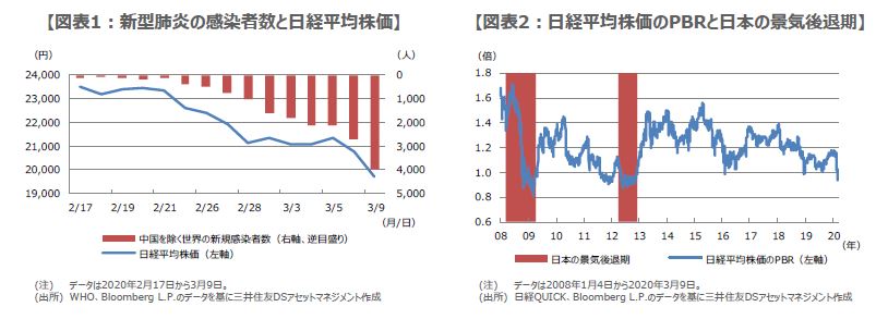 ただ、2月の最終週に入ると、新型肺炎の新規感染者数(中国を除く世界全体)は急激に増加し、足元までその傾向が続いています。日経平均株価の動きをみると、感染者数の急増にほぼ連動する形で、下げ幅を急速に拡大していることが分かります(図表1)。世界保健機関(WHO)はまだ、パンデミック(世界的な大流行)を宣言していませんが、株式市場は早々に楽観シナリオを修正し、パンデミックを織り込んだとみられます。