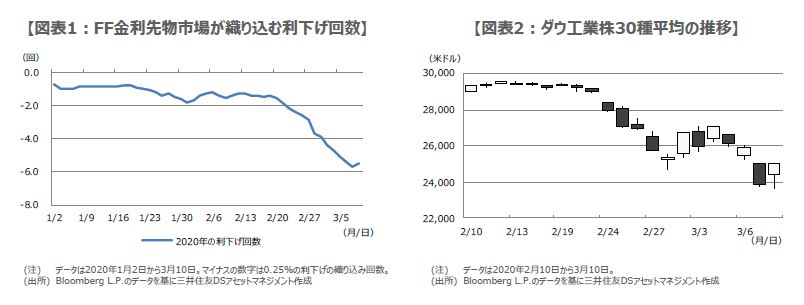 緊急利下げでも米国株式市場の不安定な動きが続いていることから(図表2)、弊社は3月17日、18日のFOMCで、0.5%の利下げが決定されると予想しています。また、信用緩和という名目で、量的緩和の導入を示唆することも想定しています。また、4月以降も金融市場の動揺が続いた場合、FRBは4月28日、29日のFOMCで、0.5%の追加利下げでゼロ金利政策に踏み切り、同時に量的緩和を実施するとみています。
