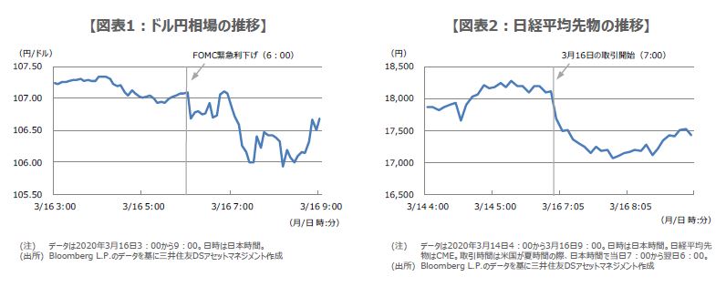 FRBが予想外のタイミングで1%の利下げを決定したことを受け、為替市場ではドル売り・円買いが優勢となりました。ドル円は日本時間3月16日午前7時半頃に、一時105円台後半までドル安・円高が進行しました(図表1)。また同じく日本時間の同日午前7時から取引が始まったS&P500種株価指数先物や日経平均先物も、売りが先行する展開となっています(図表2)。