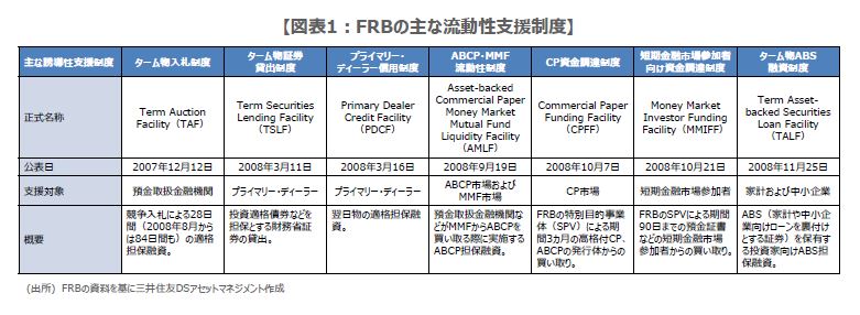 FRBは2007年12月、預金取扱金融機関に直接融資を行う「ターム物入札制度、Term Auction Facility(TAF)」を導入しました。また、2008年3月には、米国債入札に参加するプライマリー・ディーラー向けに「ターム物証券貸出制度、Term Securities Lending Facility(TSLF)」と「プライマリー・ディーラー信用制度、Primary Dealer Credit Facility(PDCF)」を導入し、資金繰りを支援しました(図表1)。