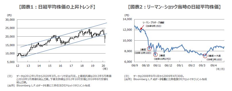一般に、株価は下落局面で何度か安値を更新するケースが多くみられます。参考までに、リーマン・ショック当時の日経平均株価は、約6カ月かけて3番底までつけ、ようやく大底を打ちました(図表2)。単純に今回と比較することは難しいのですが、少なくとも二番底をつけるシナリオは、一応想定しておく必要があると考えます。