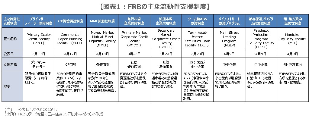 ここからは、主な流動性支援制度を確認していきます(図表1)。FRBは非預金取扱金融機関の資金繰り支援のため、3月17日に「Primary Dealer Credit Facility(PDCF)」と「Commercial Paper Funding Facility(CPFF)」を設立しました。また、マネー・マーケット・ファンド(MMF)の流動性支援のため、3月18日に「Money Market Mutual Fund Liquidity Facility(MMLF)」を設立しました。