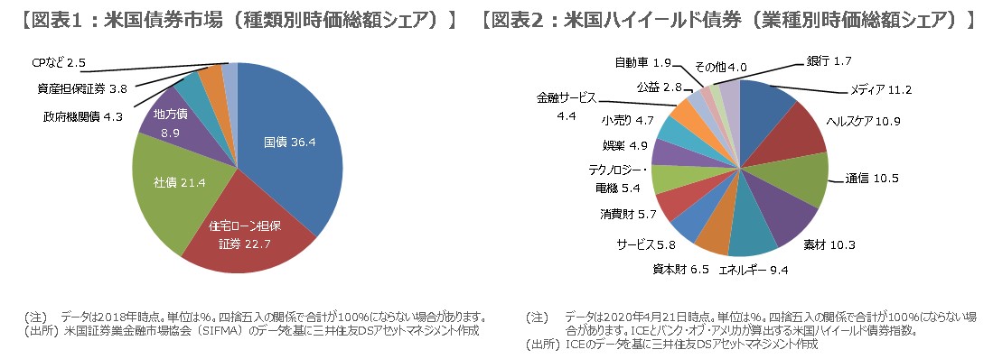 米国の債券市場については、米証券業金融市場協会(SIFMA)のデータにより、債券の種類別に時価総額を確認することができます。2018年の種類別時価総額シェアは、国債が36.4%、住宅ローン担保証券(MBS)が22.7%、社債が21.4%、地方債が8.9%、政府機関債が4.3%となっています(図表1)。したがって、ハイイールド債券を含む社債市場の規模は約9兆ドルです。