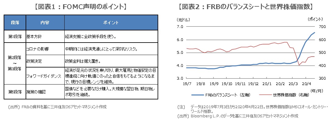 米連邦準備制度理事会(FRB)は、4月28日、29日に米連邦公開市場委員会(FOMC)を開催し、大方の予想通り、フェデラルファンド(FF)金利の誘導目標を年0.00%~0.25%で維持することを決定しました。市場の一部に、政策金利の先行き指針(フォワードガイダンス)の強化を予想する向きもありましたが、変更はありませんでした。以下、FOMC声明の主なポイントを確認していきます(図表1)。