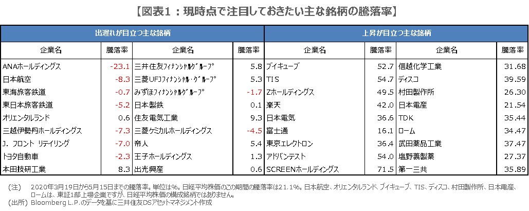 対象銘柄は日経平均株価の構成銘柄を中心に、日経平均株価が年初来安値をつけた3月19日から5月15日までの期間における騰落率を図表1にまとめました。ウィズコロナ時代では、行動制限が一定程度残る可能性があり、非接触や非対面という概念が一般的になることが予想されます。足元では、ANAホールディングス、JR東海、三越伊勢丹ホールディングスなど、接触や対面の機会が多い企業の株価は低迷しているように見受けられます。