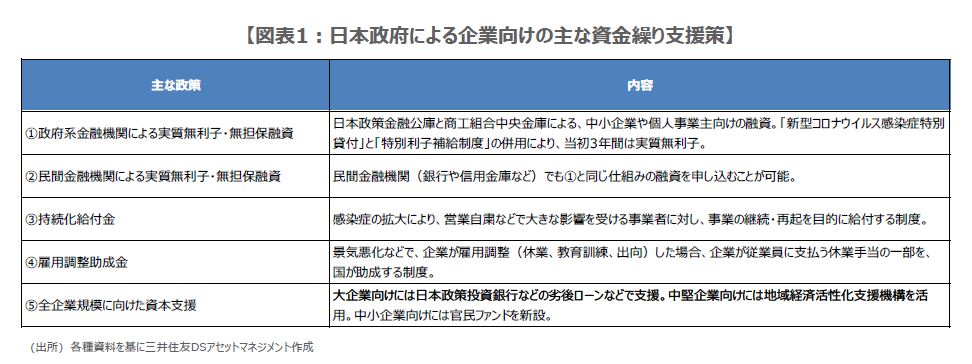 現時点で、日本政府による企業向けの資金繰り支援策は、ほぼ出そろったように思われます。主な政策として、①政府系金融機関による実質無利子・無担保融資、②民間金融機関による実質無利子・無担保融資、③持続化給付金、④雇用調整助成金、⑤全企業規模に向けた資本支援、が挙げられます(図表1)。そこで、今回のレポートでは、それぞれの政策について問題点を整理し、今後の課題を考えます。