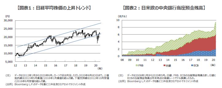 一方、日経平均株価は、ここ13営業日で、2,500円超上昇しているため、そろそろ調整売りに押されてもおかしくはありません。ただ、コロナ・ショック後の主要中央銀行による巨額の流動性供給が(図表2)、一定程度、株式相場の下値を支えるとみています。日経平均株価については、まずは目先、6月末に21,850円を超えて取引を終えることができるか、注目したいと思います。