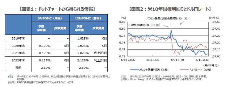 そして、今回のFOMCで、特に注目されたのが、FOMCメンバーが適切と考える政策金利水準の分布図(ドットチャート)でした。ドットチャートでは、17人のメンバーのうち15人が、少なくとも2022年末までゼロ金利政策の継続が適切と考えており、マイナス金利を見込むメンバーはゼロであることが明らかになりました(図表1)。これにより、FOMCの政策運営は、ゼロ金利政策の長期継続が、当面の基本スタンスになると思われます。