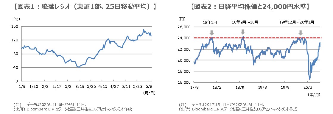 日本株は、このところの上昇で、相場に過熱感がみられていました。例えば、株価の「買われすぎ」、「売られすぎ」を判断するテクニカル指標である騰落レシオ(東証1部、25日移動平均)は、一般に120%を超えると買われすぎで、相場は過熱気味と解釈されます。騰落レシオは、5月21日以降、120%を超え続けており、6月11日時点でも131.6%となっています(図表1)。