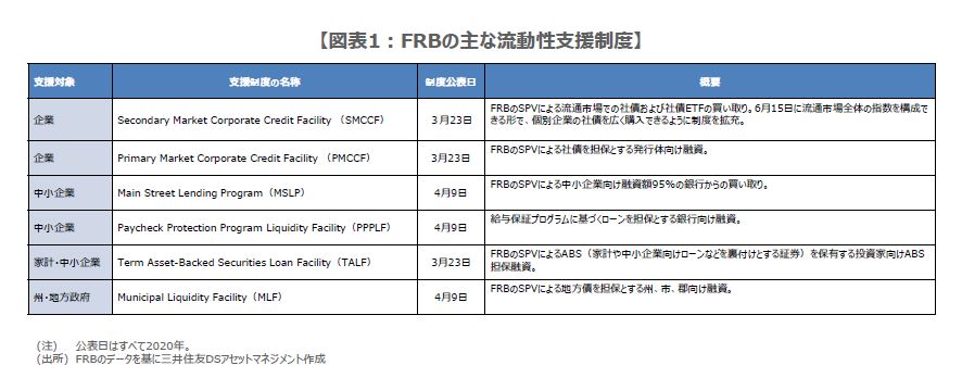 ここで、FRBの主な流動性支援策をまとめてみます(図表1)。企業向けには、SMCCFのほか、「Primary Market Corporate Credit Facility(PMCCF)」があります。これは、社債を担保に、FRBのSPVが発行体向けに融資を行うものです。また、中小企業は、「Main Street Lending Program(MSLP)」や、「Paycheck Protection Program Liquidity Facility(PPPLF)」を利用することができます。