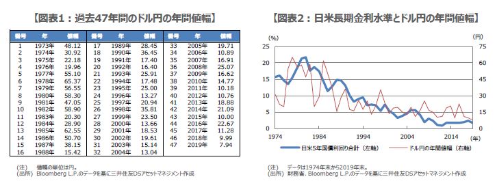 ドル円の年間の値幅は、変動相場制に移行した1973年から2019年までの47年間を通じ、縮小傾向にあります(図表1)。この背景には、2018年12月26日付レポート「ドル円の値幅が年々縮小している理由」などでも指摘しましたが、①ドルと円は同方向に動きやすい性質があること、②日本の経常収支の構造が変化したこと、③日米長期金利に対する為替感応度が低下したこと、があると思われます。