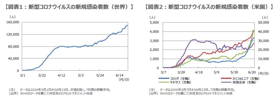 米国の感染者数動向も予断を許しません(図表2)。米国立アレルギー感染症研究所(NIAID)のファウチ所長は6月23日、米下院エネルギー・商業委員会の公聴会で、米国内の新型コロナウイルスの新規感染者に関し、「憂慮すべき急増」がみられると述べました。また、米南部諸州で感染拡大が続いている点を指摘し、感染が夏季に沈静化する可能性は低いとの見解を示しました。