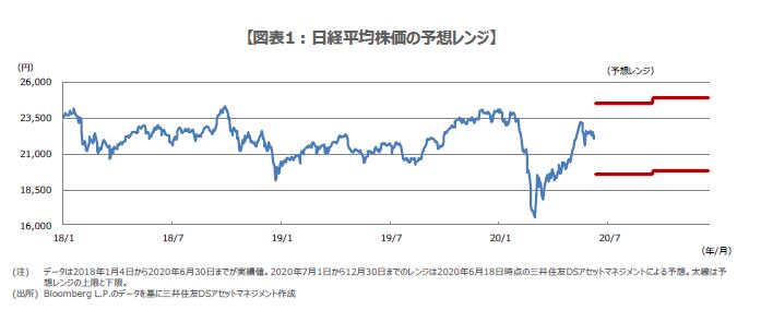年末までの日経平均株価を展望した場合、①世界経済の成長率は7-9月期以降、回復に向かう、②世界的な都市封鎖(ロックダウン)再開は回避される、という前提のもと、ごく緩やかな価格水準の切り上げが予想されます。具対的には、7-9月期のレンジが19,600円~24,500円で9月末の着地は22,800円、10-12月期のレンジは19,800円~24,900円で、12月末の着地は23,100円を想定しています(図表1)。