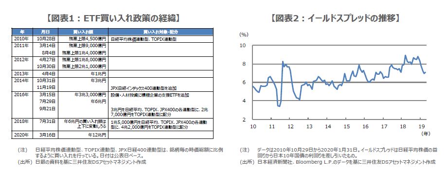 日銀は2010年以降、リスクプレミアム縮小を目的に、株安局面で積極的にETF買い入れを実施
