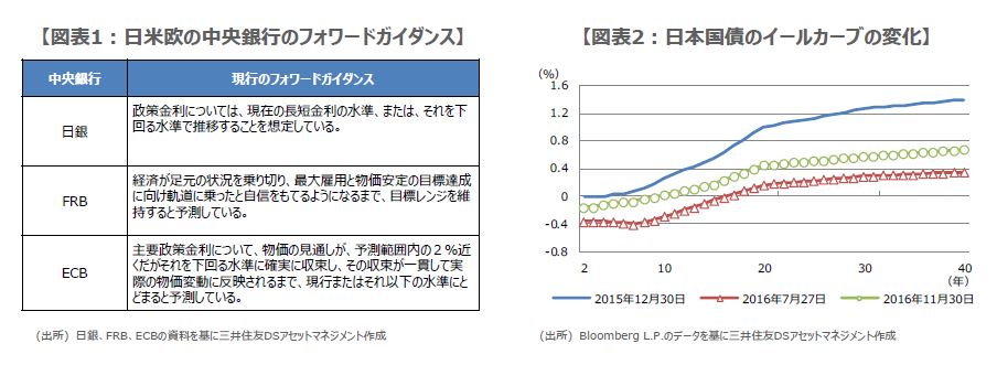 日銀の現在のフォワードガイダンスは、①のオープンエンド型であり、政策金利について、「現在の長短金利の水準、または、それを下回る水準で推移することを想定している」とし、追加緩和の可能性を示唆しています(図表1)。また、米連邦準備制度理事会(FRB)、欧州中央銀行(ECB)も、フォワードガイダンスを採用していますが、日銀と同様、①のオープンエンド型となっています。