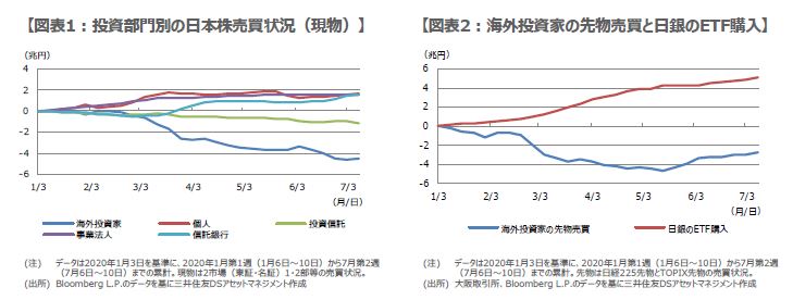 以上より、年初からの現物取引については、海外投資家の売り越し(累計で約4.5兆円)と、国内投資家の買い越し(個人、事業法人、信託銀行の累計合算で約4.7兆円)、という構図が確認できます。なお、先物取引に目を向けると、海外投資家は年初から足元まで、累計約2.8兆円を売り越しています(図表2)。海外投資家の先物売りは、裁定業社(証券会社など)の裁定取引を通じ、現物の売り要因となります。
