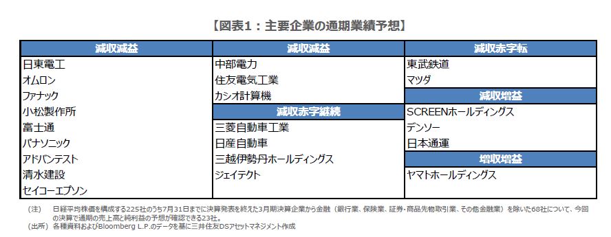 今回の決算で、28社が今期の業績予想を発表しましたが、通期の売上高と純利益の予想が確認できるのは、22社でした。詳細をみると、減収減益予想は12社、減収で赤字継続予想は4社、減収で赤字転落予想は2社となっています(図表1)。また、減収増益予想はSCREENホールディングス、デンソー(自動車部品最大手)などの3社、そして、増収増益予想はヤマトホールディングス1社だけでした。
