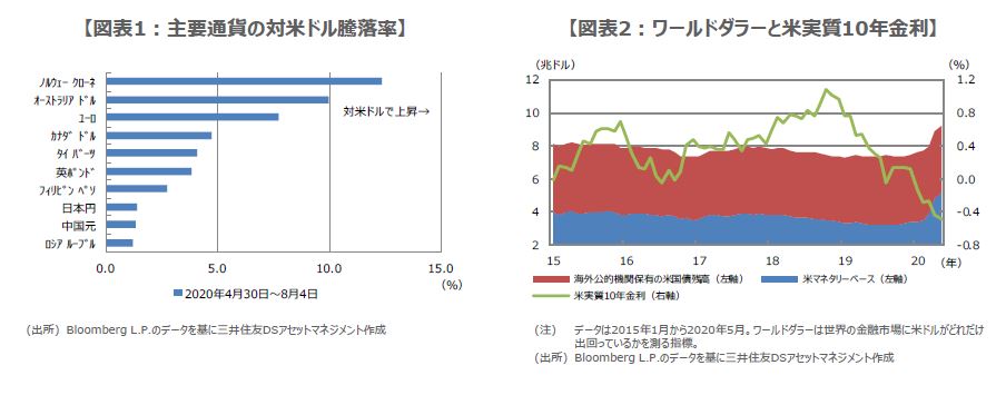 一般に、物価は2~3カ月の短い期間で、大きく変動することはまれであるため、これも違和感のない結果といえます。なお、足元のドル安進行は、米国の実質金利がマイナス圏に沈んでいることに加え、FRBにより世界の金融市場に米ドルが大量供給されたことも大きいと思われ、これはワールドダラーの急増で確認できます(図表2)。そのため、為替市場では、しばらく米ドル安の地合いが続くことも予想されます。